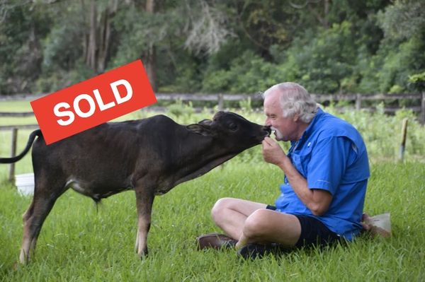 Jefferson is a handsome lad who will make a great addition to any herd. His mom is gorgeous black cow with some white trim and his dad is our flashy reverse paint bull (predominantly white with red and black paint spots) named Picasso. He has kid of a bay color to him right now but he's looking like he may turn black like his mom. Jefferson has been worked with and is super friendly. He loves to be petted, he'll eat from your hand, and he'll give kisses if you let him. When we walk into the pasture he walks right over to us looking to be petted. It's rare to find gorgeous, well bred, puppy dog tame zebu but we have a few for sale right now. Jefferson is $1800.00 and his date of birth is 5/28/20. He is Foundation Pure with the IMZA and will come with full registration papers. (**All of the breeding animals in our herd have been genetically tested and confirmed to be free of the zebu dwarfism mutation!! Always be sure to confirm this before you buy.)