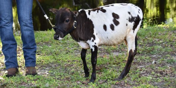 Phantom has it all going on folks. He is sired by an extremely rare tri-color black & white & red pure Swede line cow (not to be confused with the more common black & white that comes from the Twister/Hatch line of crossbreeding zebu with longhorn & watusi cattle). His mom could not be any more amazingly gorgeous. His dad is an incredibly tiny little stud of a bull named Marquis, standing only 28 inches tall and also out of the Swede line of zebu. He carries genetics to produce calves of both amazing color and amazing size. As you can see in this picture, Phantom is quite small and stands smaller than other calves of similar age. He is very friendly and will happily eat right out of your hand. Phantom is $1800.00 and his date of birth is 4/18/20. He is Foundation Pure with the IMZA and will come with full registration papers. (**All of the breeding animals in our herd have been genetically tested and confirmed to be free of the zebu dwarfism mutation!! Always be sure to confirm this before you buy.)